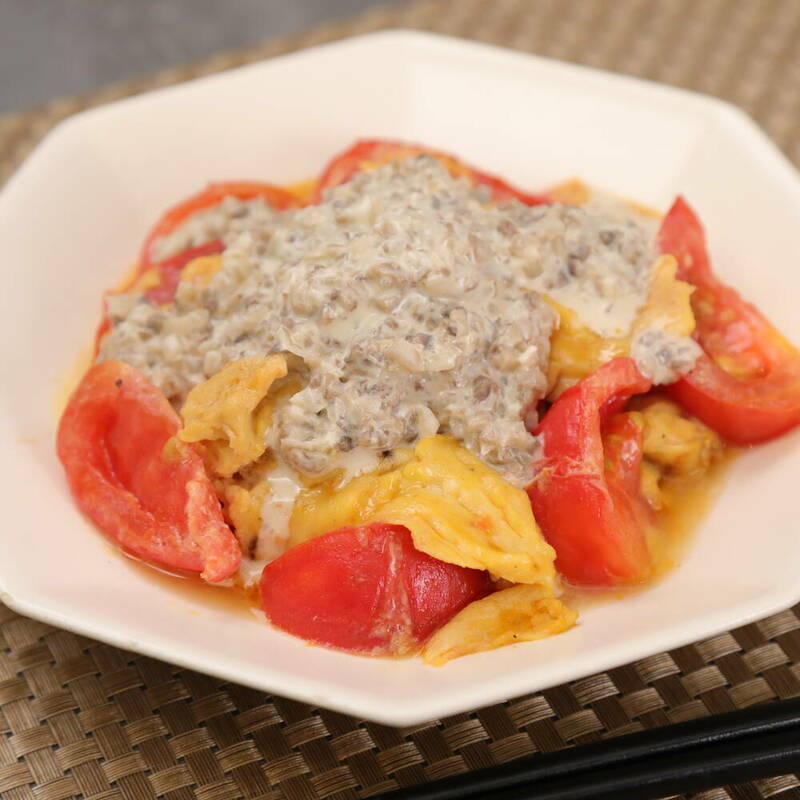 トマトを<6>に入れてさっと合わせ、同じフライパンにごま油をひいて、卵を流し入れ、半熟状態まで加熱する。