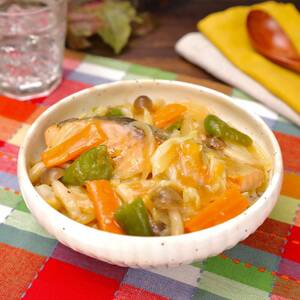 器にご飯をよそい鮭をのせる。<8>を盛りつけ、取り分けておいた【A】を回しかける。