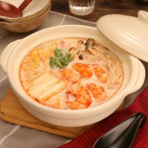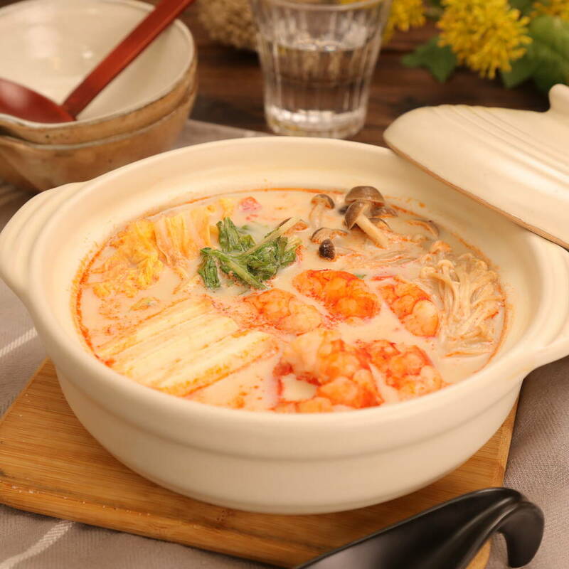 沸騰し、野菜がしんなりしたら<7>に<4>のえびを加え、沸騰直前まで加熱する。