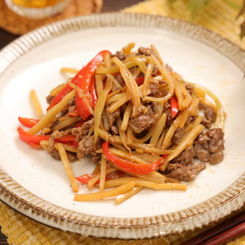 たけのこ、牛肉を加え強火でさっといためる。【B】を加えよく合わせる。