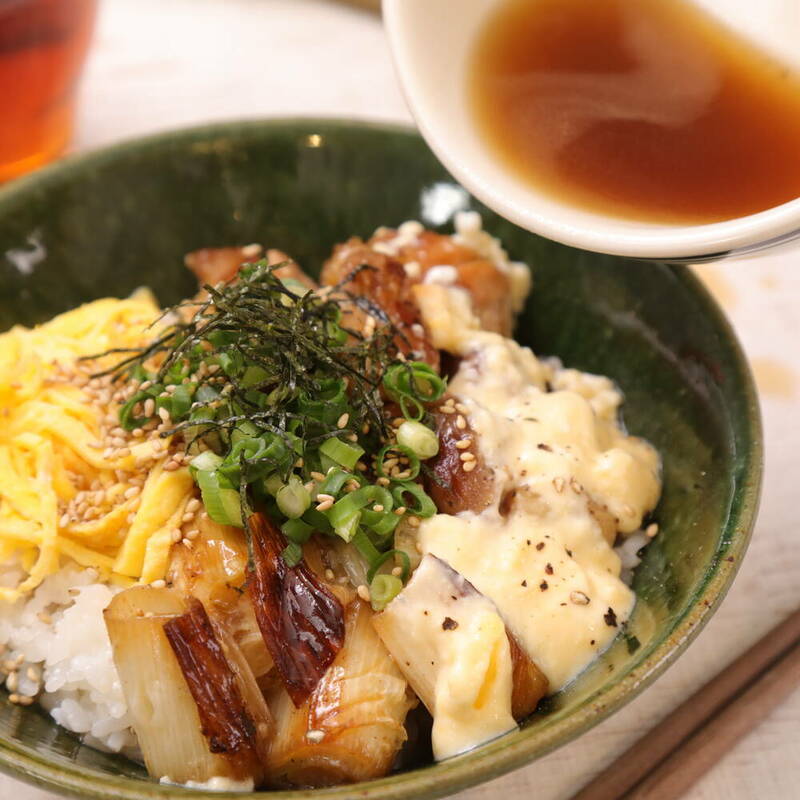 温かいごはんの上に<2>と<3>をのせ、青ねぎ、白いりごま、刻み海苔を飾る。別皿に<4>を盛り付ける。
