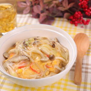 しんなりしたら【A】を入れ沸騰させる。火を弱め、<4>をもう一度よくかき混ぜてから回し入れとろみがついたら火を止める。