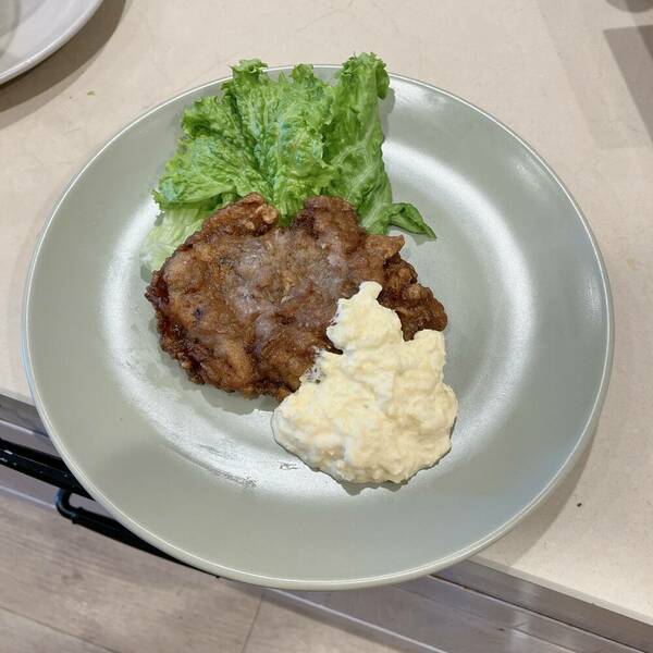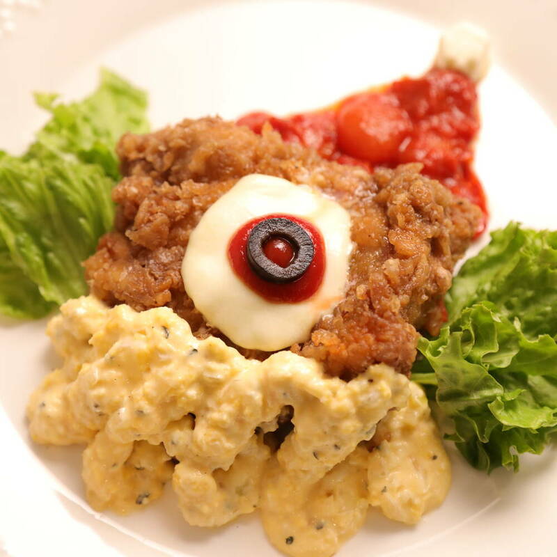 【盛り付け】器にグリーンリーフを敷き中央にフライドチキンを盛る。チーズの上にケチャップを絞りオリーブを乗せて目にする。