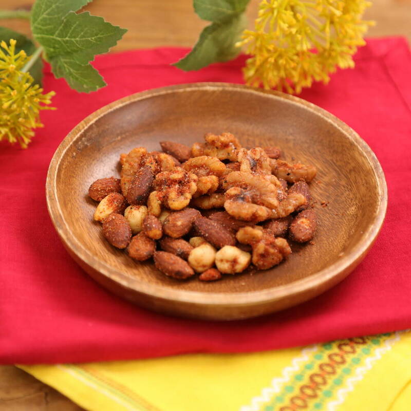 フライパンにミックスナッツとオリーブオイルを入れて混ぜる。全体に油が回ったら、弱火にする。
