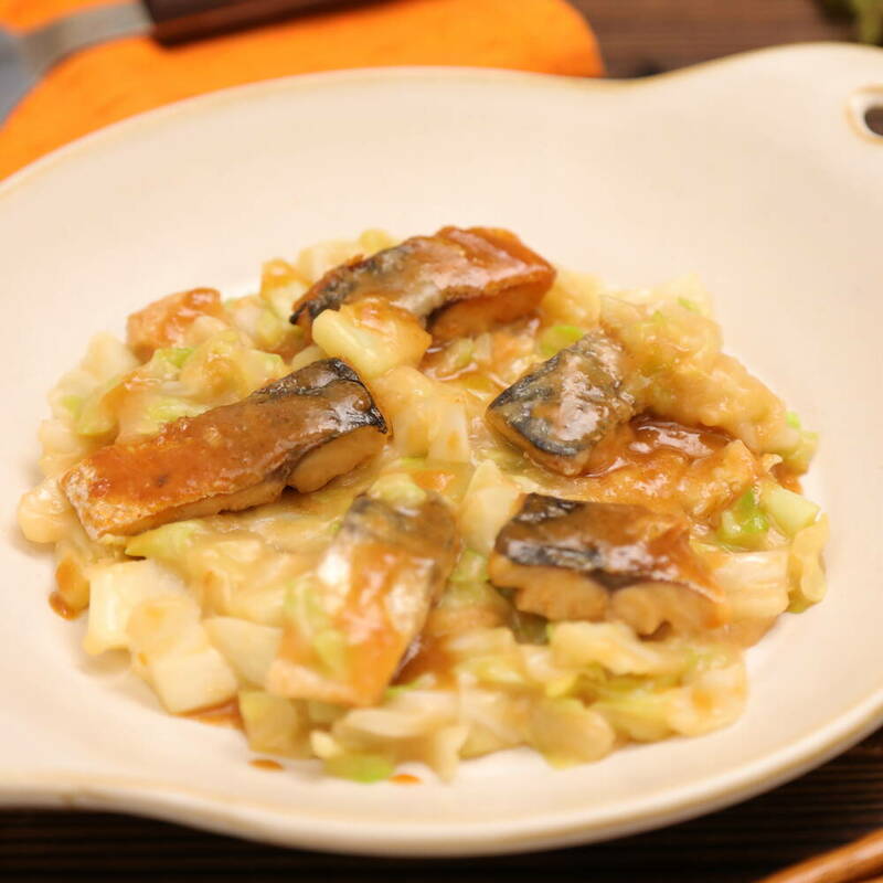 キャベツは1cm程度のざく切りにする。さばは骨を取り除き、3cm程度の幅にカットし、軽く塩(分量外)をふる。