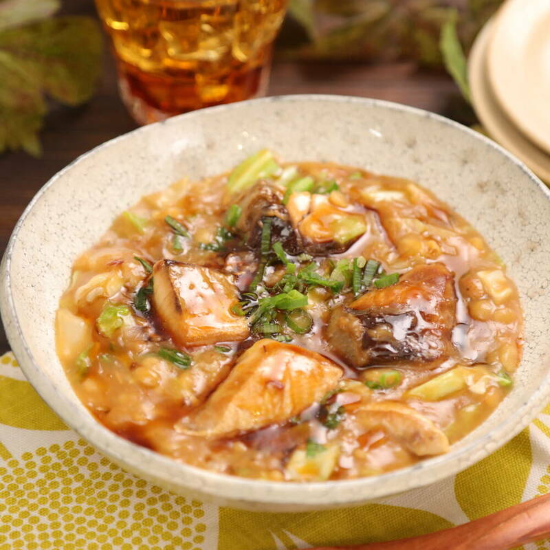 煮立ったらとろみが付くまで全体を混ぜ合わせる。ぶりを戻し(煮汁はそのまま)さらに混ぜ合わせる。