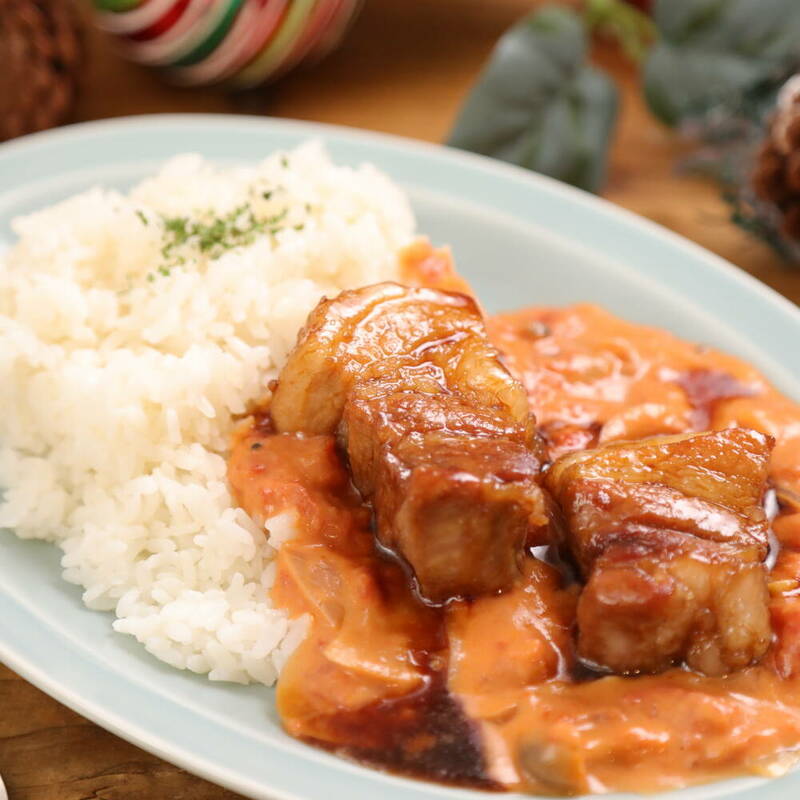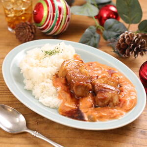 カットトマト、生クリーム、デミグラスソース、しょうゆ、コンソメを加えて沸騰させる。弱火で4分程度煮込む。