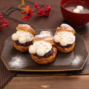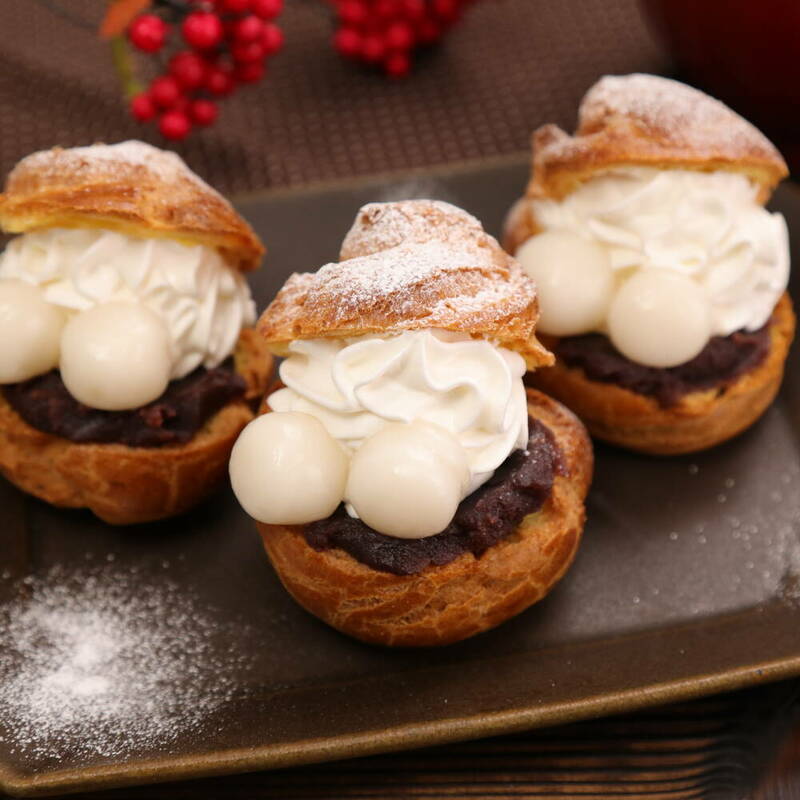 <9>にこしあんを25g塗る。ホイップクリームを20g絞る。白玉を2個のせる。残りも同様に行う。
