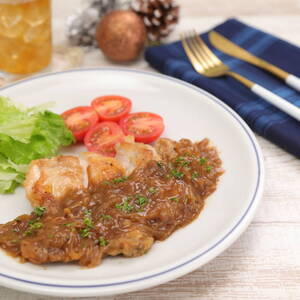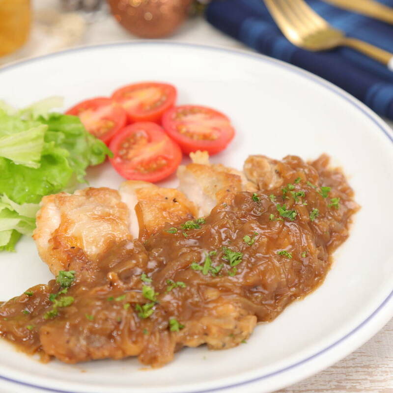 器に<1>、食べやすい大きさに切った鶏肉を盛り付ける。<9>をかけ、パセリをふる。