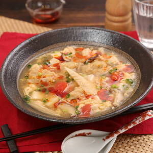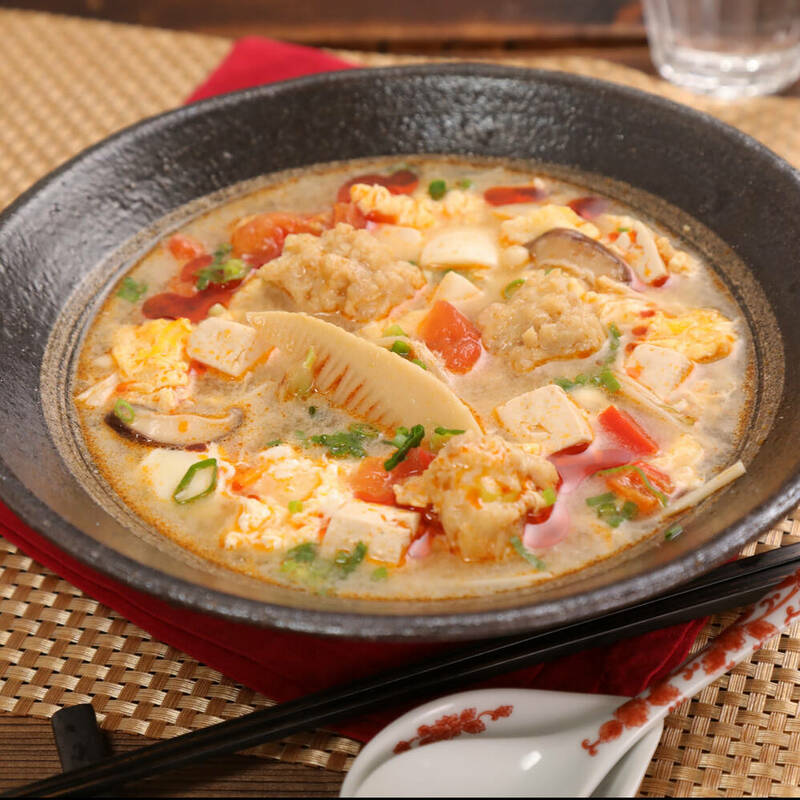 しいたけ、えのきを入れしんなりするまで加熱し、【B】、トマト、たけのこ、絹ごし豆腐、水溶き片栗粉を入れ再度沸騰させる。