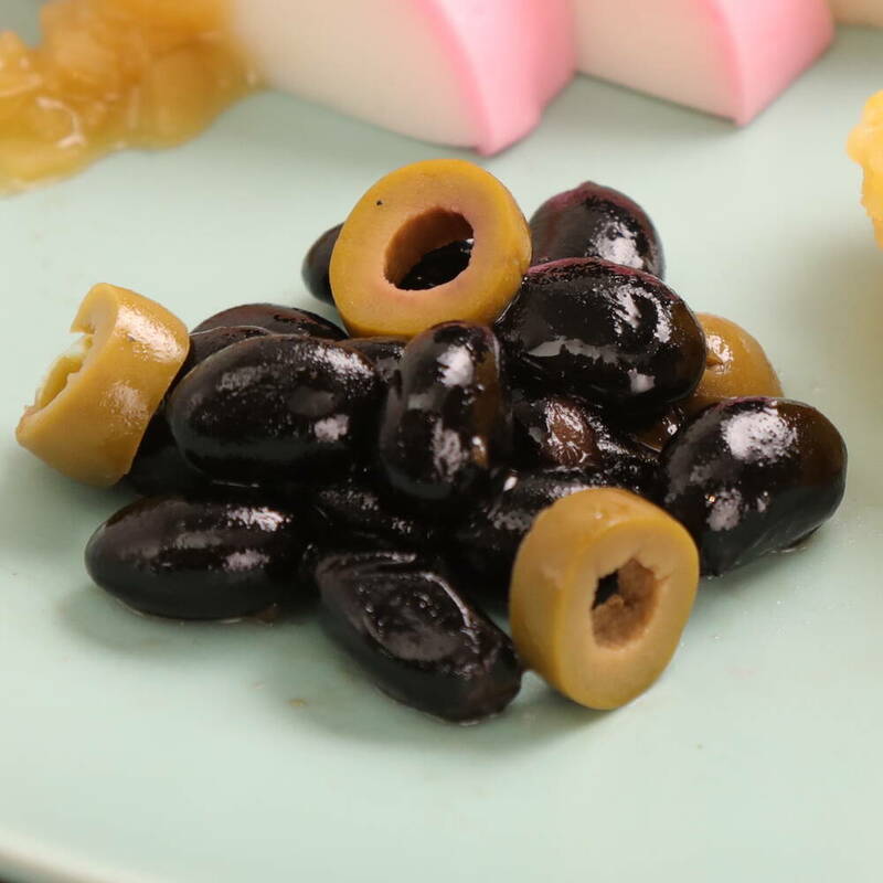 オリーブはスライスする、黒豆とオリーブオイルと合わせる。器に盛る。