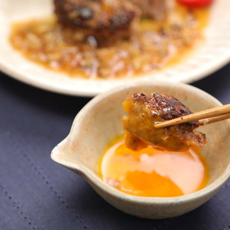 器にグリーンリーフ、ミニトマト、ハンバーグを盛り付ける。ソースをかける。お好みで卵黄につける。