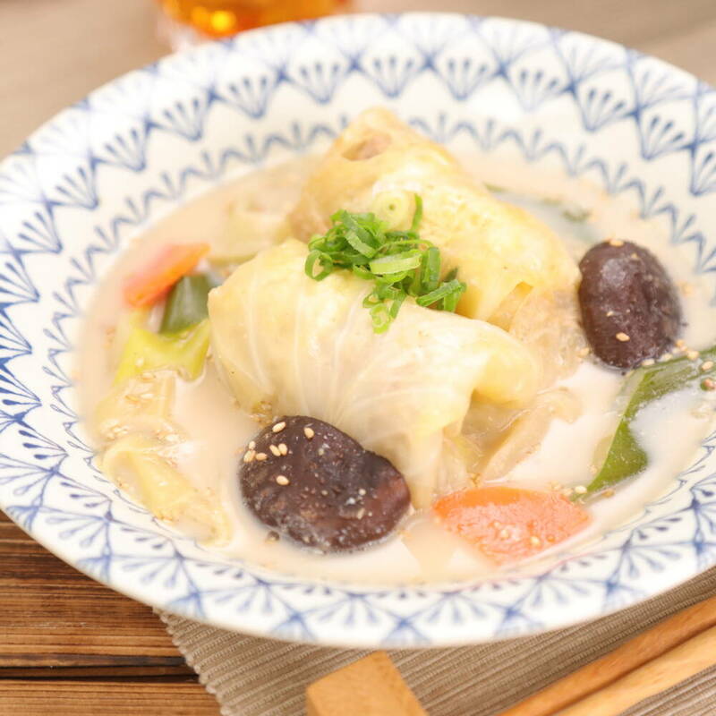 キャベツは水にぬらして耐熱皿にのせる。ラップをふんわり被せて電子レンジ(600W)で4分加熱する。粗熱をとる。