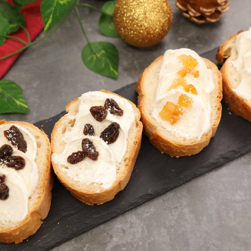 <2>に塗り、レーズン、オレンジピールをそれぞれかける。粉チーズをかける。