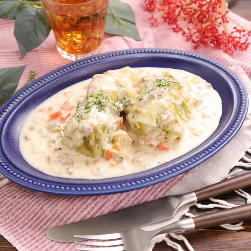 火を止めてロールキャベツを器に盛り付ける。薄力粉、バター(常温)をボウルで混ぜ合わせて加える。