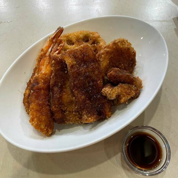 <3>、<4>、<5>をバッター液にくぐらせ、パン粉をまぶす。170℃の油できつね色になるまで揚げる。