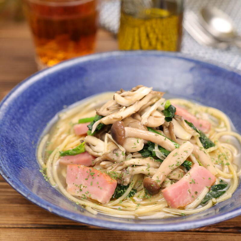 フライパンに多めのオリーブオイルをひき、中火でベーコンを香ばしく焼く。にんにくのみじん切りを加え炒める。