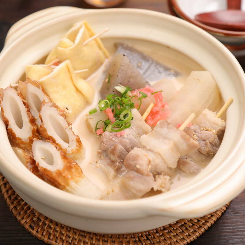 豚串に焼き色がついたら鍋に加え沸騰させる。アクをひきながら3分程度煮込む。