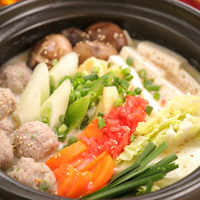 中火で沸騰直前まで加熱したら紅しょうがと青ねぎ、白ごまを散らす。