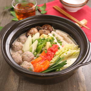 【肉団子】の材料と刻んだ長ねぎを混ぜ合わせ、団子状に成形する。沸騰させた<4>に加え浮いてくるまで中火で火を通す。