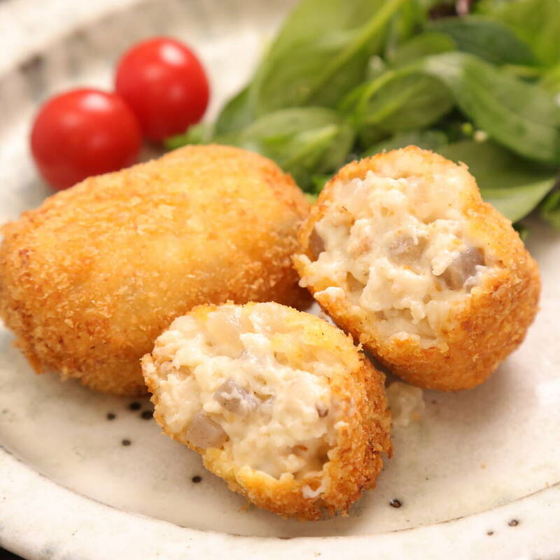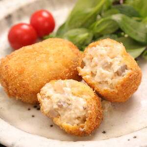 <5>を4等分し、ラップなどで俵形に成形し、衣を薄力粉、卵、パン粉の順につける。