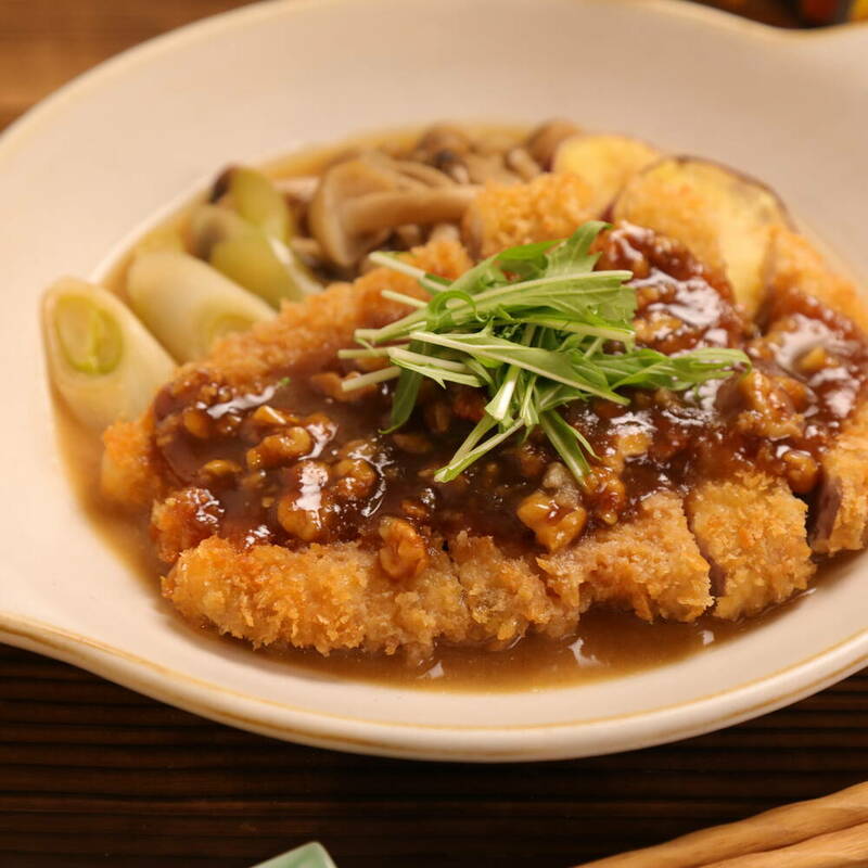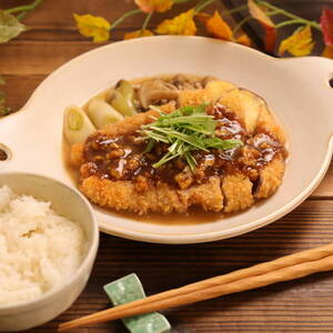 <6>をカツに塗り、フライパンに入れて1分ほどさっと煮る。器に盛り付けて水菜を乗せる。