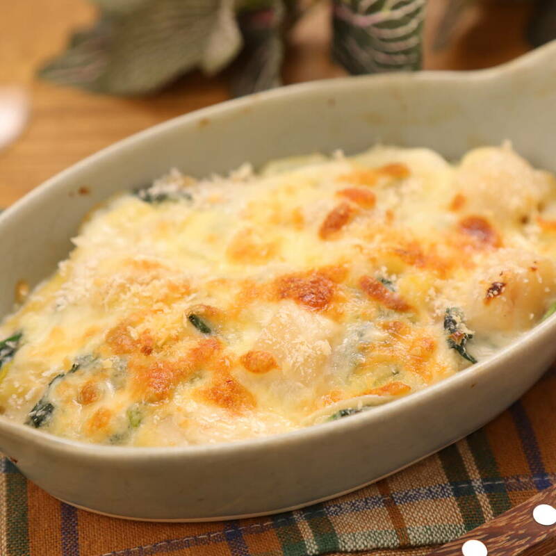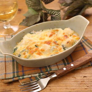 牛乳を少しずつ加え、とろみがついたら、<1>、<2>、<4>、<5>を入れ、塩こしょうをして味を調える。