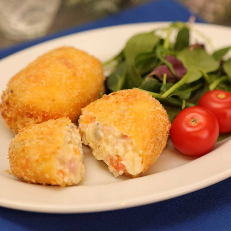 薄力粉、溶き卵、パン粉の順につけ、170℃に熱した油で揚げる。
