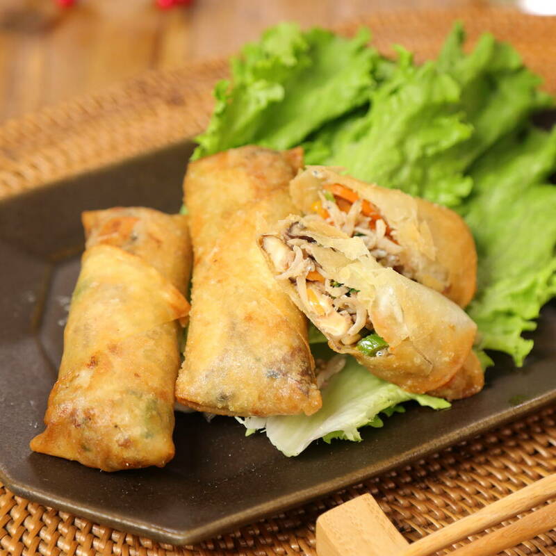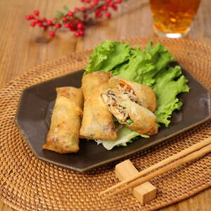 器にグリーンリーフを盛り、春巻きはお好みで切って盛り付ける。