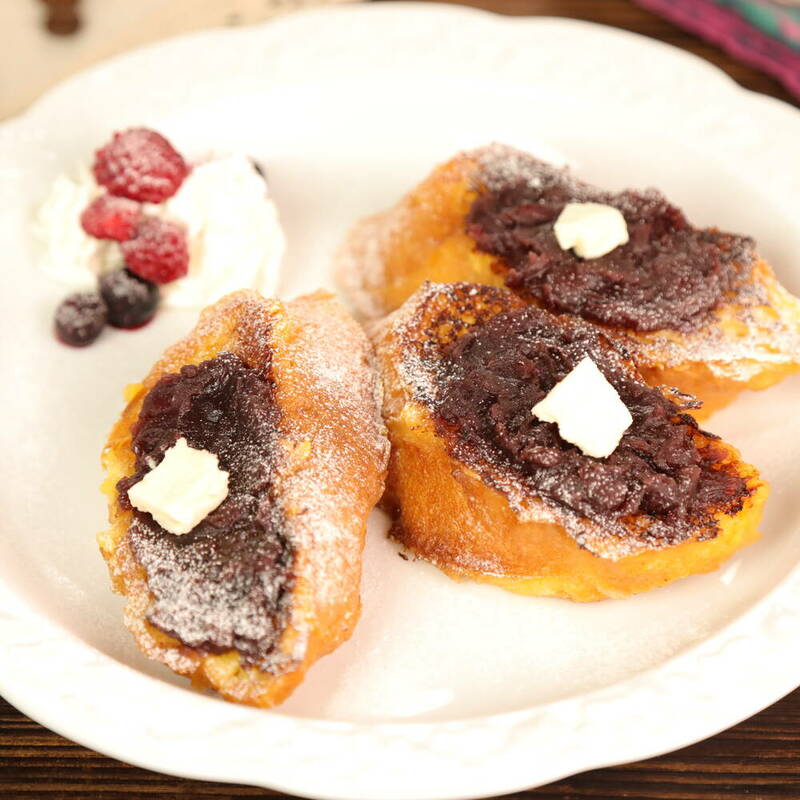 温めた卵液を<1>に流し入れ、片面5分ずつ染み込ませる。