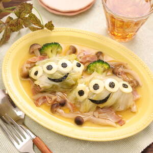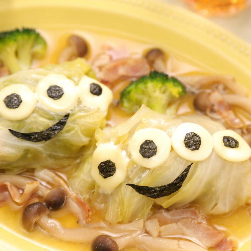 器にロールキャベツを盛り、上部にブロッコリーを盛る。表面に丸型のチーズを4つ、丸いのりを乗せて顔にする。