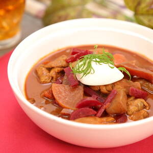 強めの中火で煮立たせるように煮て、器に盛り付ける。サワークリーム、ディルを飾る。