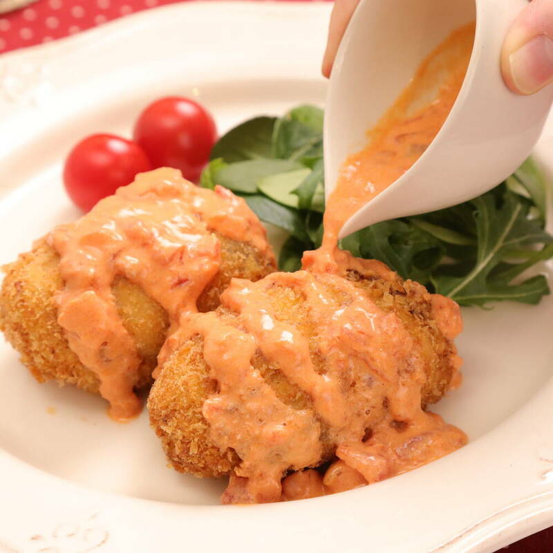 <5>を4等分にし、ラップなどで俵形に成形し、薄力粉、卵、パン粉の順番で衣をつける。
