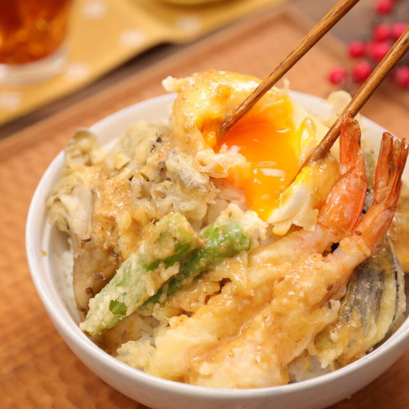 天ぷらの材料に薄力粉をまぶし【A】にをからめて180℃の油で揚げる。
