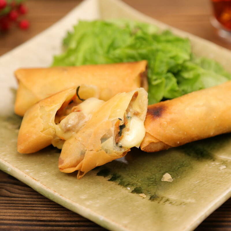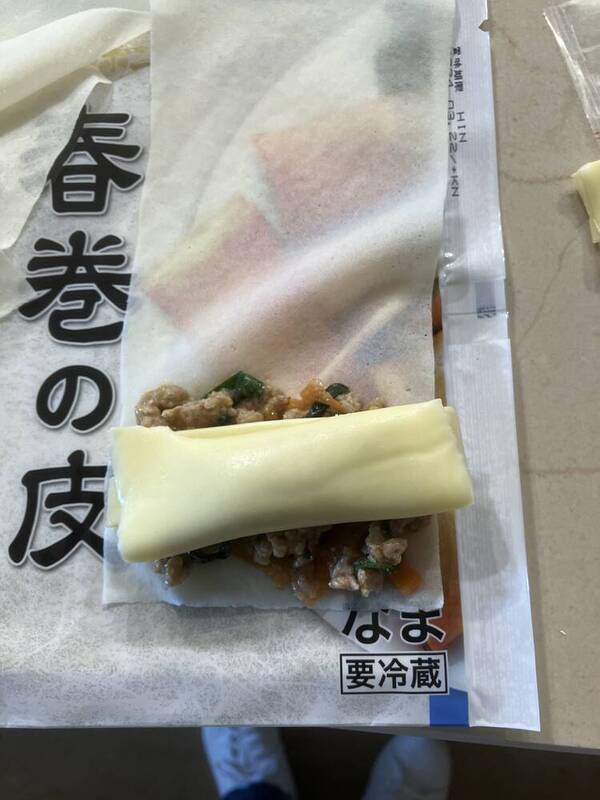 春巻きの皮の手前に<5>をのせひと巻きする。両端を閉じ、閉じ目に【B】を塗り最後まで巻く。