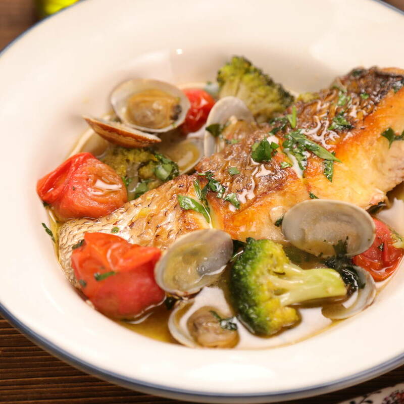 皮目がきつね色になったら上下を返し、ミニトマト、あさり、ブロッコリー、にんにくを戻す。白ワインを加えアルコールを飛ばす。