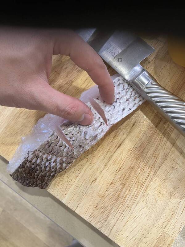 鯛は皮目に包丁で横向きに切れ目を入れる。(切りづらかったら皮を引っ張りながら切れ目を入れてください)