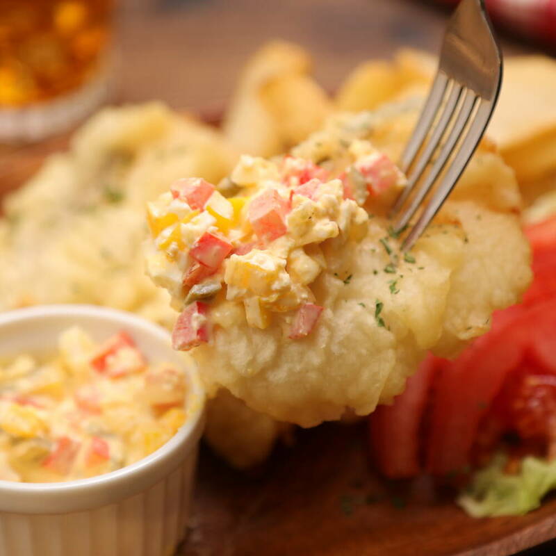 たらの表面の水分を軽くペーパーで拭い、【A】をくぐらせ180℃の油できつね色になるまで揚げる。