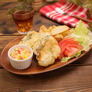 揚がったらバットに移す。ポテトも揚げておく。器にたら、ポテト、トマト、レタスを盛り付ける。