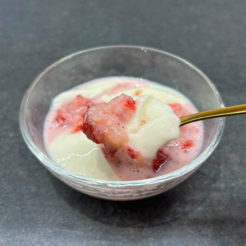 いちごをフォークで潰し、はちみつと和え、牛乳を入れて混ぜ合わせる。