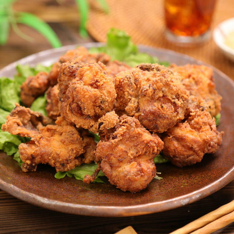 器にグリーンリーフを敷き、唐揚げを盛り付ける。おかかしょうゆマヨをつけていただく。