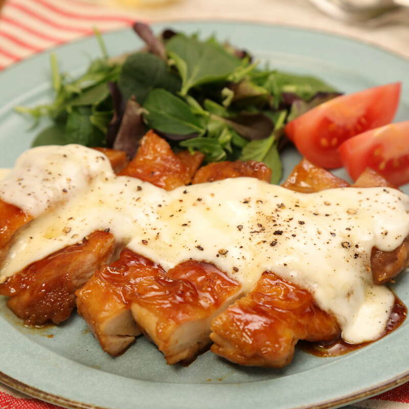 【照り焼きチキン】鶏肉は余分な脂肪や皮を取り除き、塩こしょうで下味をつける。薄力粉を全体にまぶす。