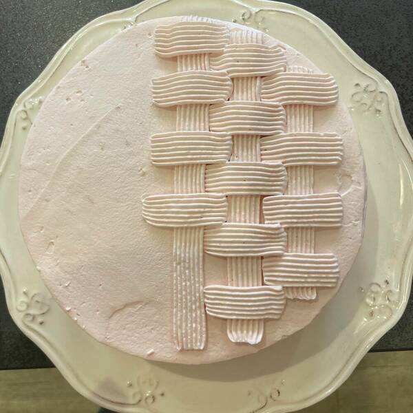 片目口金のクリームをケーキ上面の端にまっすぐ絞る。直線クリームの上にはみ出すよう横向き等間隔に絞る。