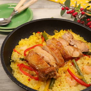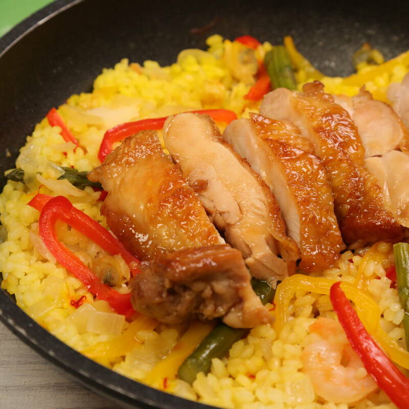 【A】、<1>のパプリカ、アスパラガス、シーフードミックスを加えてふたをし、中火で10分ほど炊く。
