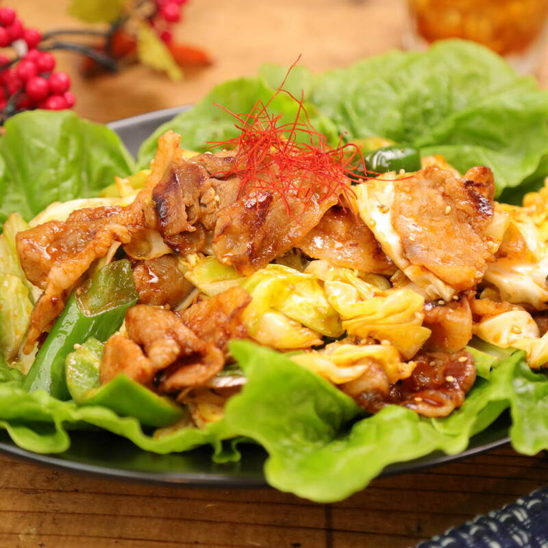 器にサンチュを敷き、回鍋肉を盛る。白ごまを散らし、糸切り唐辛子を乗せる。
