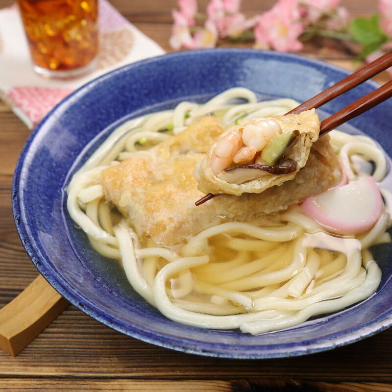 【きつねあげ】油揚げは半分に切り、菜箸を転がして袋状に剥がし、調味料と共に煮汁が少なくなるまで煮て、粗熱を取る。
