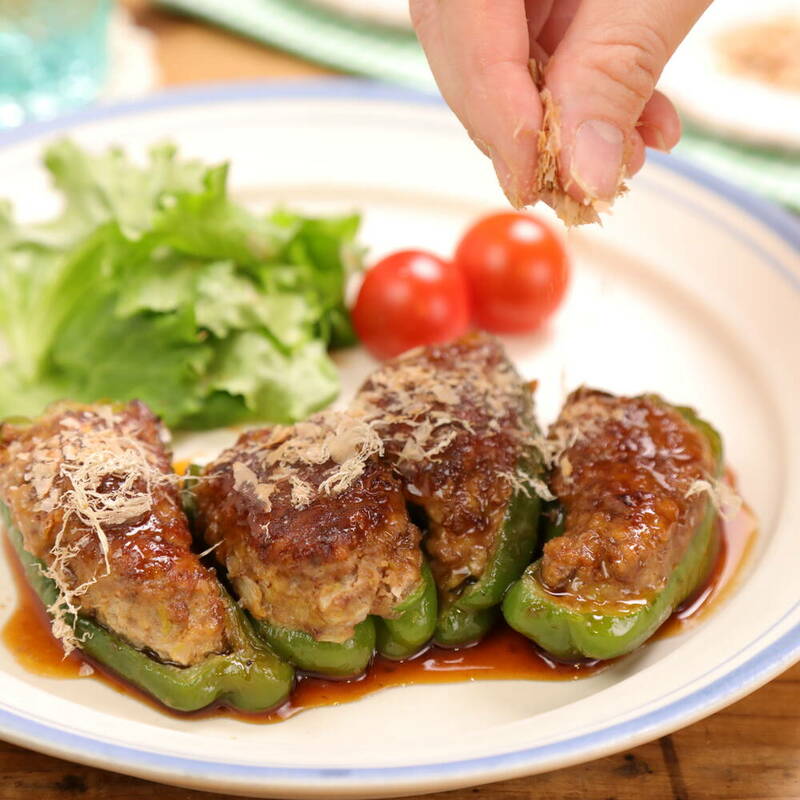 ピーマンの内側に薄力粉をまぶし、<3>をピーマンに詰める。