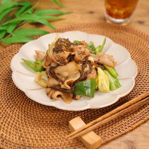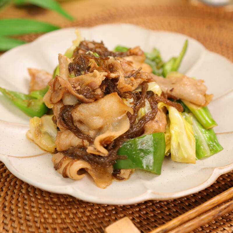 炒めた具材を戻してよく炒め合わせる。火を止めて、ごま油、もずくを加え合わせる。器に盛り付ける。