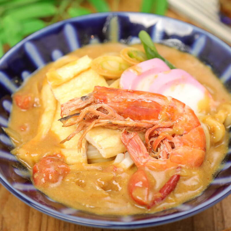 鍋で湯を沸かしうどんを規定時間茹でる。器に盛り付けスープを注ぐ。えびを盛り付ける。