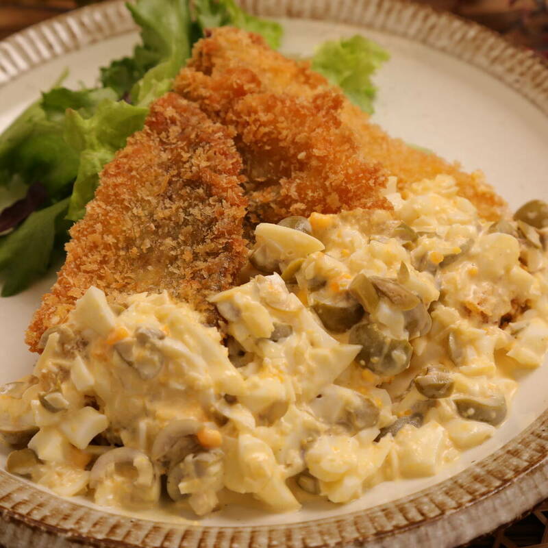 ゆで卵をボウルに入れフォークで潰す。【A】、グリーンオリーブ、水気を切った玉ねぎを混ぜ合わせる。